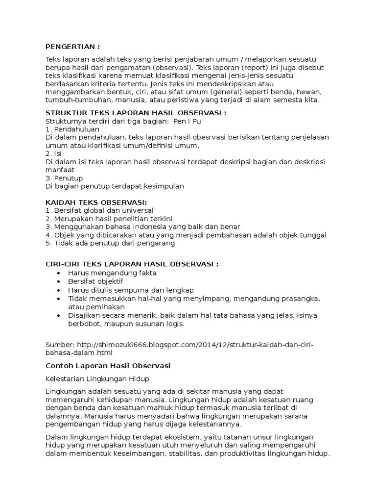 Berikut ini adalah contoh dari teks laporan hasil observasi bunga bangkai, simak di bawah . 8 contoh teks laporan hasil observasi: Sebelum membahas contoh laporan, kita ingat kembali bahwa teks laporan hasil observasi merupakan teks yang termasuk dalam jenis teks laporan . Observasi dalam kbbi artinya peninjauan secara cermat. Pengertian, contoh, struktur, ciri, kaidah kebahasaan, fungsi, tujuan, langkah menyusun .